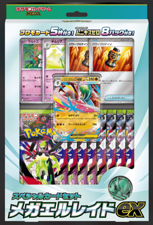 カード5枚入り | プロモカード「メガエルレイドex」(キラ):1枚 プロモカード「パワープロテイン」(キラ):2枚 プロモカード「ラルトス」:1枚 プロモカード「キルリア」:1枚 拡張パック「ムニキスゼロ」:8パック ※拡張パックには、カードがランダムに5枚封入されています。 ポケモンコイン:1枚 |
